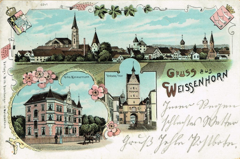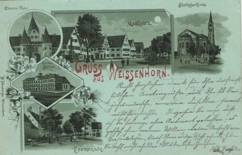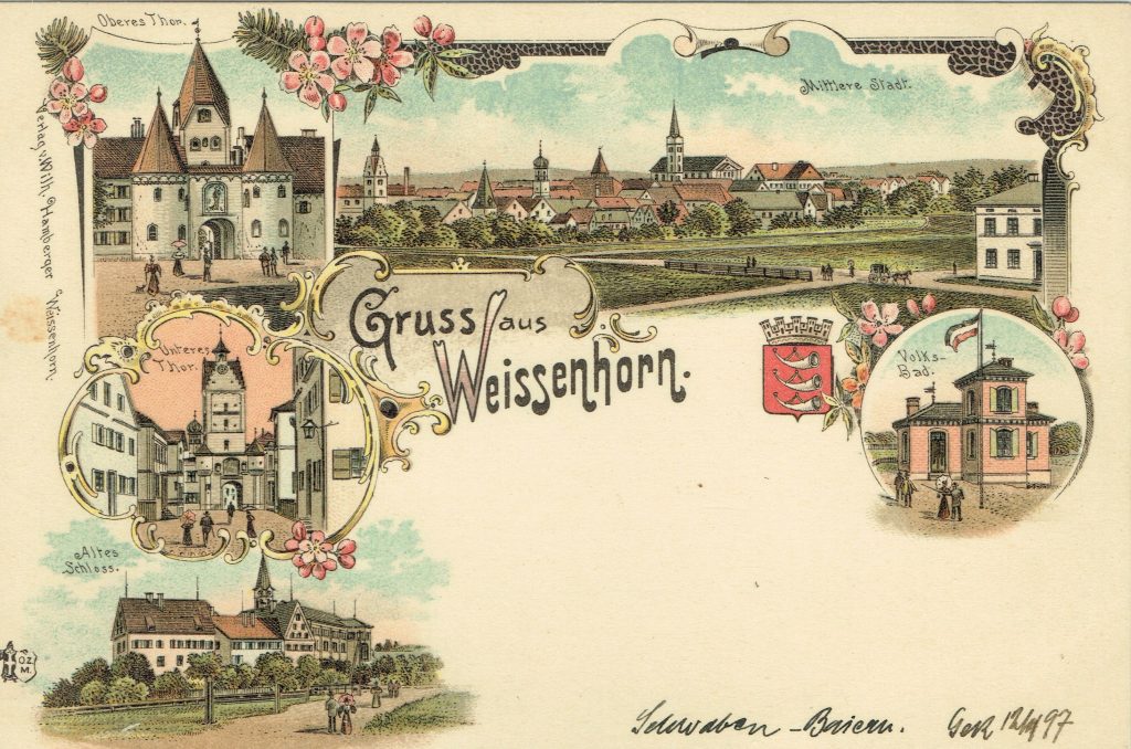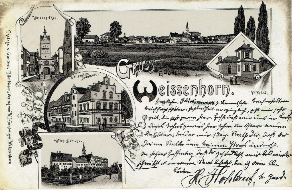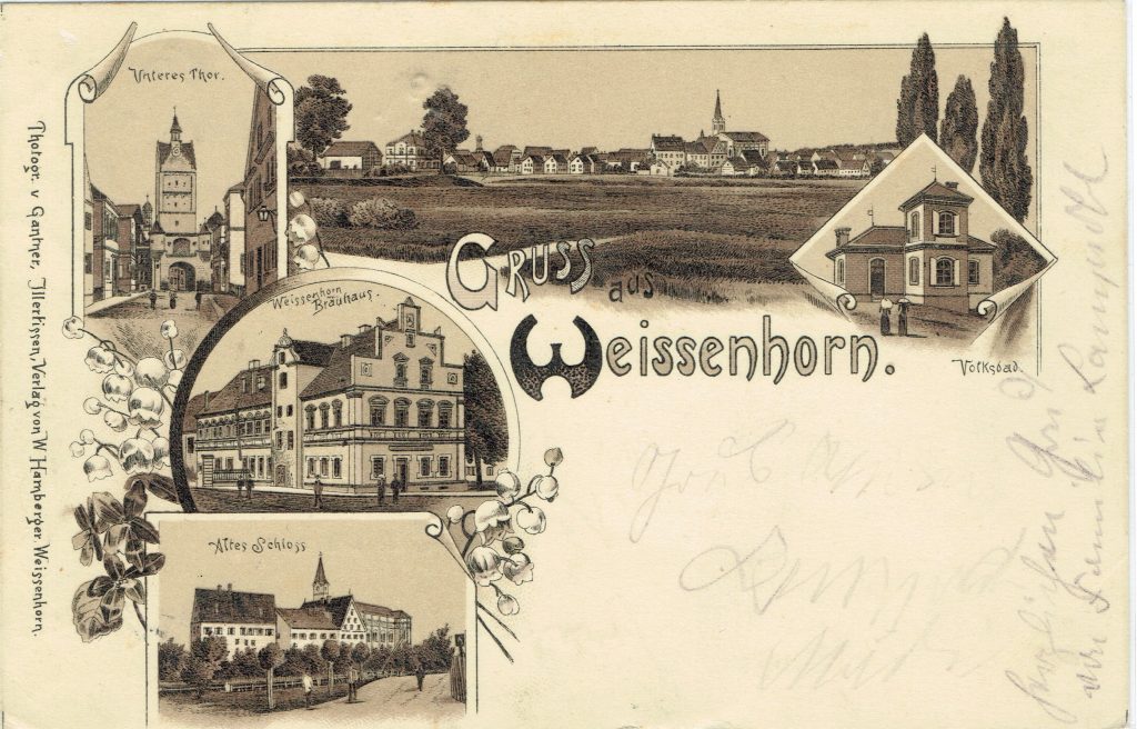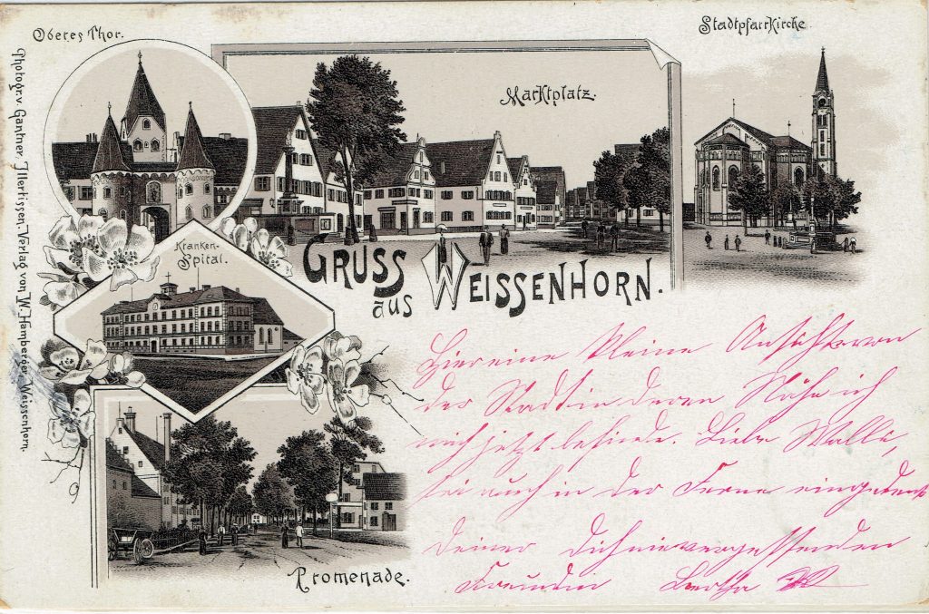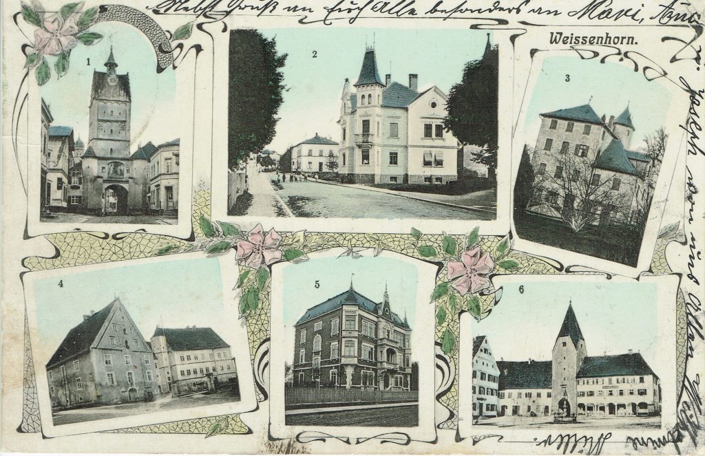 Ohne Kommunikation ist menschliches Leben kaum vorstellbar. Ohne moderne technische Hilfsmittel ist das über weitere Strecken jedoch nur mittelbar, z. B. durch Boten möglich. Dies war immer aufwendig und teuer und zudem durch Postmonopole geschützt. Eine grundlegende Verbesserung der Bürger brachte erst das 19. Jahrhundert, als das Thurn- und Taxis´sche Postmonopol fiel und die Frankierung 1849 durch die Einführung von Briefmarken vereinheitlicht wurde. Einer der größten Meilensteine dieser Entwicklung war 1870 die Einführung der Correspondenzkarte, eines standardisierten Formulars, das mit einem Porto von 5 Pfennigen die Hälfte des Briefportos kostete. Sie hatte eine Anschriftenseite und eine Seite für die Mitteilungen. Bald schon gab es darauf auch kleine Bilder, Bildstempel, Zeichnungen, etc., woraus sich im Laufe der Jahre die noch heute verbreitete Ansichtskarte entwickelte. Ab 1895 nimmt die Verbreitung der Ansichtskarte explosionsartig zu. Die Karten werden von kleinen lokalen Druckereien produziert, in Weißenhorn war diese die Druckerei des Wilhelm Hamberger. Seine ersten Karten wurden einfarbig in verschiedenen Braun- und Blautönen gedruckt, die Bildseite zeigte mehrere kleine Ansichten aus der Stadt. Die Abbildungen und ihre Anordnung variieren etwas. Dieser Typus, die sogenannte Mehrbildkarte ist bis heute weit verbreitet. Schon 1897 werden die Karten bunt, die einfarbigen Karten der Anfangszeit verschwinden innerhalb von 1-2 Jahren völlig. Schnell werden die Darstellungen lebendiger, wirken natürlicher, der aufkommende Jugendstil findet Eingang in die Gestaltung und die Fotografie lieferte die Bilder.