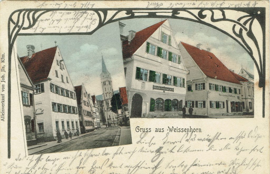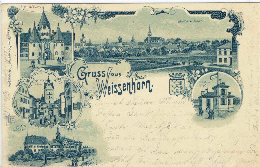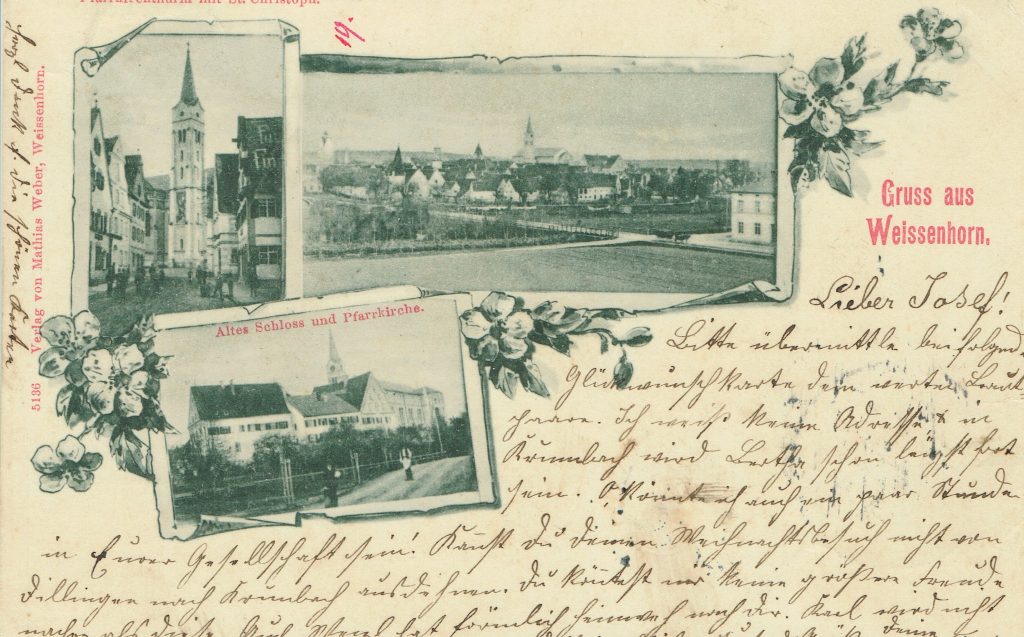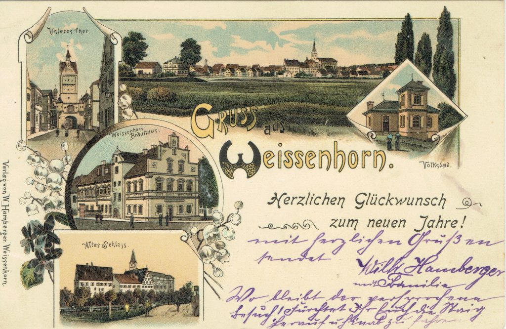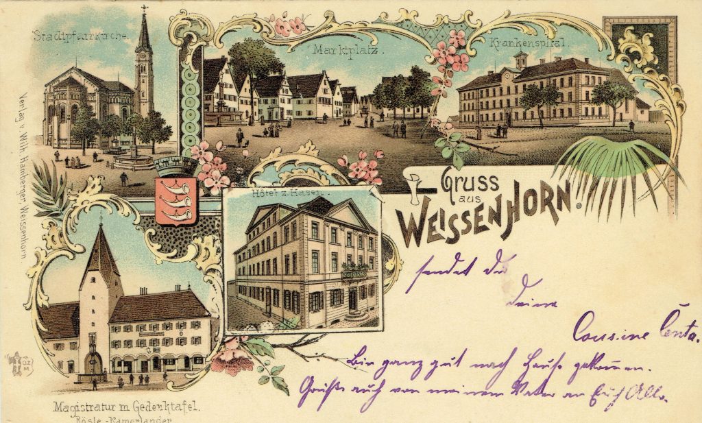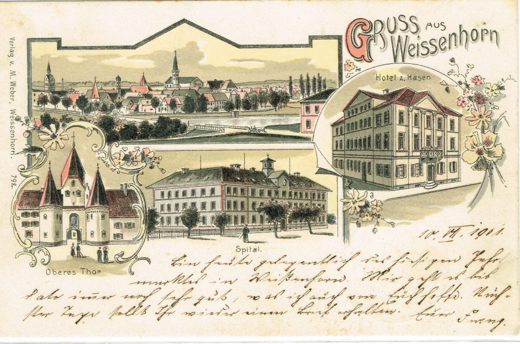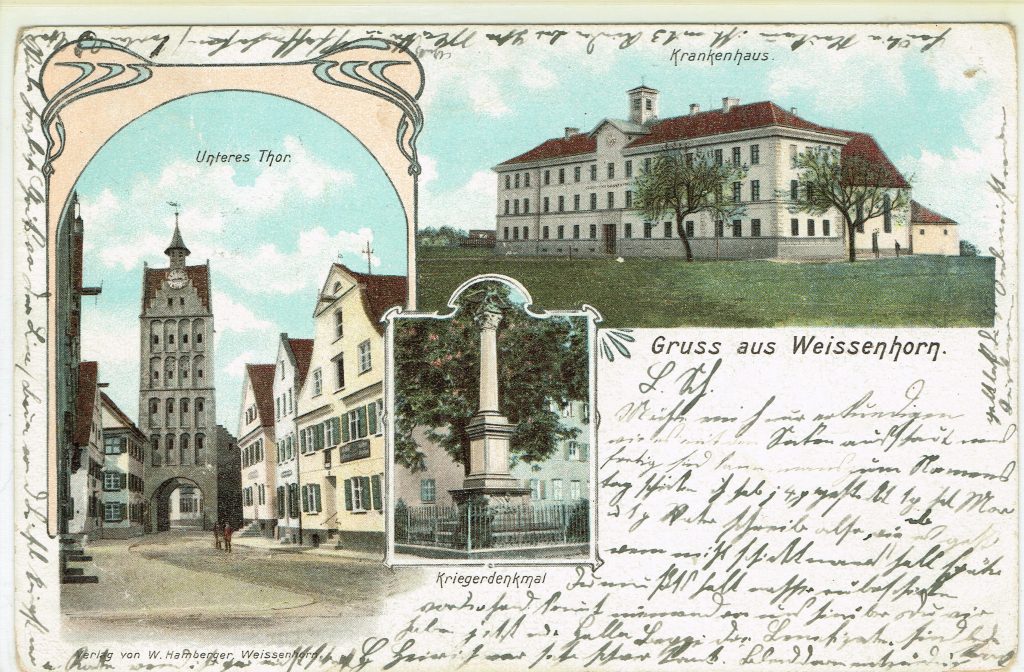 Ohne Kommunikation ist menschliches Leben kaum vorstellbar. Ohne moderne technische Hilfsmittel ist das über weitere Strecken jedoch nur mittelbar, z. B. durch Boten möglich. Dies war immer aufwendig und teuer und zudem durch Postmonopole geschützt. Eine grundlegende Verbesserung der Bürger brachte erst das 19. Jahrhundert, als das Thurn- und Taxis´sche Postmonopol fiel und die Frankierung 1849 durch die Einführung von Briefmarken vereinheitlicht wurde. Einer der größten Meilensteine dieser Entwicklung war 1870 die Einführung der Correspondenzkarte, eines standardisierten Formulars, das mit einem Porto von 5 Pfennigen die Hälfte des Briefportos kostete. Sie hatte eine Anschriftenseite und eine Seite für die Mitteilungen. Bald schon gab es darauf auch kleine Bilder, Bildstempel, Zeichnungen, etc., woraus sich im Laufe der Jahre die noch heute verbreitete Ansichtskarte entwickelte. Ab 1895 nimmt die Verbreitung der Ansichtskarte explosionsartig zu. Die Karten werden von kleinen lokalen Druckereien produziert, in Weißenhorn war diese die Druckerei des Wilhelm Hamberger. Seine ersten Karten wurden einfarbig in verschiedenen Braun- und Blautönen gedruckt, die Bildseite zeigte mehrere kleine Ansichten aus der Stadt. Die Abbildungen und ihre Anordnung variieren etwas. Dieser Typus, die sogenannte Mehrbildkarte ist bis heute weit verbreitet. Schon 1897 werden die Karten bunt, die einfarbigen Karten der Anfangszeit verschwinden innerhalb von 1-2 Jahren völlig. Schnell werden die Darstellungen lebendiger, wirken natürlicher, der aufkommende Jugendstil findet Eingang in die Gestaltung und die Fotografie lieferte die Bilder.