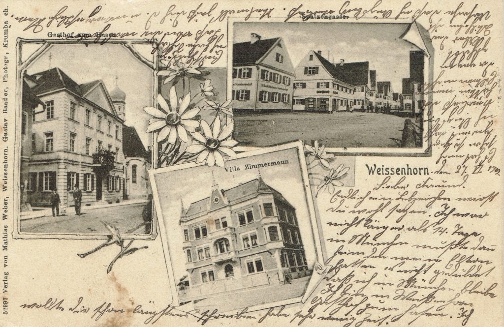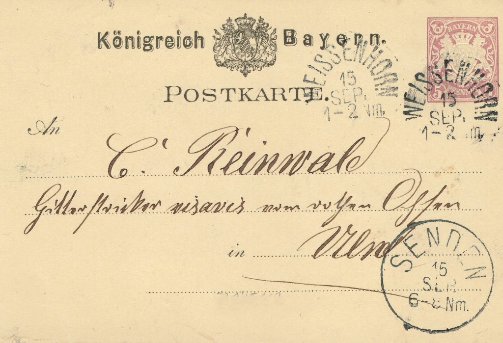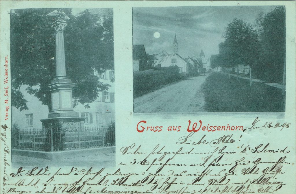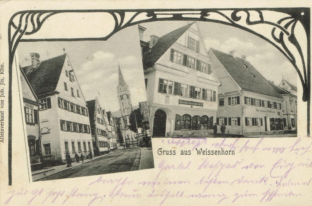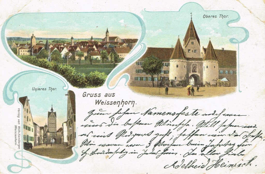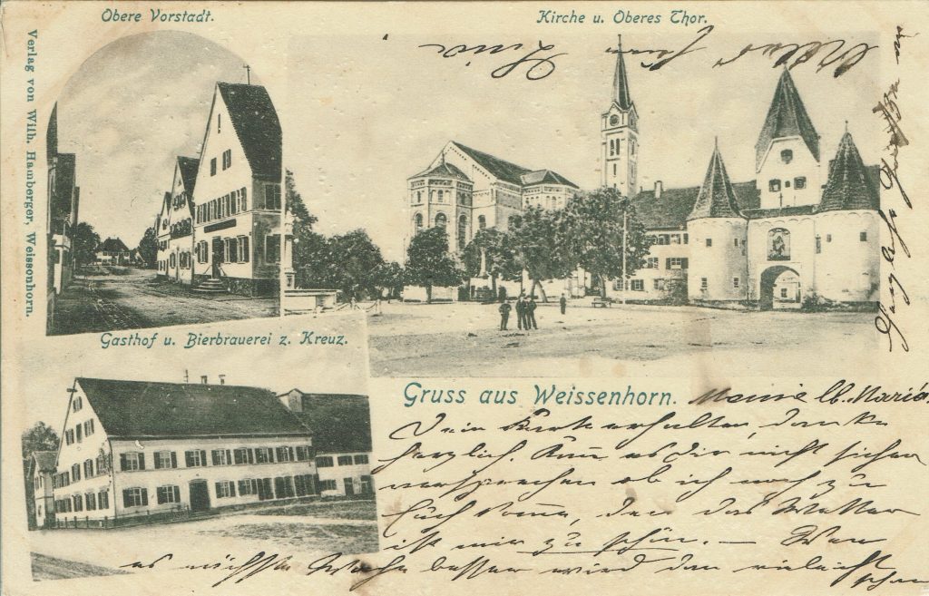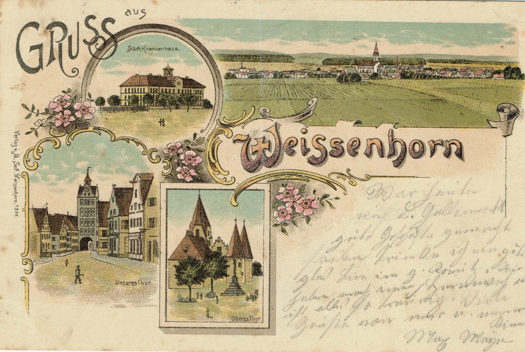 Ohne Kommunikation ist menschliches Leben kaum vorstellbar. Ohne moderne technische Hilfsmittel ist das über weitere Strecken jedoch nur mittelbar, z. B. durch Boten möglich. Dies war immer aufwendig und teuer und zudem durch Postmonopole geschützt. Eine grundlegende Verbesserung der Bürger brachte erst das 19. Jahrhundert, als das Thurn- und Taxis´sche Postmonopol fiel und die Frankierung 1849 durch die Einführung von Briefmarken vereinheitlicht wurde. Einer der größten Meilensteine dieser Entwicklung war 1870 die Einführung der Correspondenzkarte, eines standardisierten Formulars, das mit einem Porto von 5 Pfennigen die Hälfte des Briefportos kostete. Sie hatte eine Anschriftenseite und eine Seite für die Mitteilungen. Bald schon gab es darauf auch kleine Bilder, Bildstempel, Zeichnungen, etc., woraus sich im Laufe der Jahre die noch heute verbreitete Ansichtskarte entwickelte. Ab 1895 nimmt die Verbreitung der Ansichtskarte explosionsartig zu. Die Karten werden von kleinen lokalen Druckereien produziert, in Weißenhorn war diese die Druckerei des Wilhelm Hamberger. Seine ersten Karten wurden einfarbig in verschiedenen Braun- und Blautönen gedruckt, die Bildseite zeigte mehrere kleine Ansichten aus der Stadt. Die Abbildungen und ihre Anordnung variieren etwas. Dieser Typus, die sogenannte Mehrbildkarte ist bis heute weit verbreitet. Schon 1897 werden die Karten bunt, die einfarbigen Karten der Anfangszeit verschwinden innerhalb von 1-2 Jahren völlig. Schnell werden die Darstellungen lebendiger, wirken natürlicher, der aufkommende Jugendstil findet Eingang in die Gestaltung und die Fotografie lieferte die Bilder.
