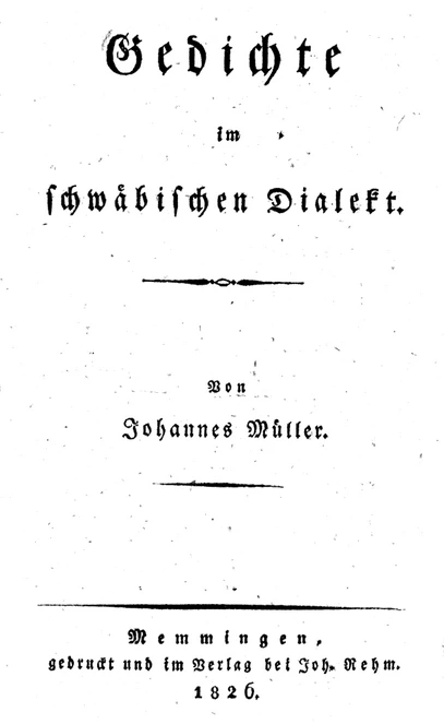 Der erste den wir kennen ist Johannes Müller in Memmingen, der damit zugleich auch die später sehr produktive Schar der Memminger Mundartdichter anführt. Das wenige was wir von ihm wissen verdanken wir Theodor Hildenbrand, einem Memminger Realschulrektor, der 1887 bei Kösel in Kempten die Sammlung Bayerischer Mundartgedichte So is‘ bei’n uns in Boarnland herausgegeben hat. Von seinem Vater lernte Müller den Beruf des Formstechers, arbeitete später aber als Anwaltsschreiber. Die bibliografischen Angaben bei Kragler und Holder stimmen zudem nicht überein. Die erste nachweisbare Ausgabe (insgesamt 16 Seiten) von ihm ist 1815 bei Christoph Müller in Memmingen erschienen unter dem Titel Vier Gedichte im schwäbischen Dialekt und enthält A sches Abschidsliad für Bonabatlen, Bartlame, oder der Fischermittwoch, Die Martinsgans und Die Weihnachtszeit. Daneben hat er offensichtlich auch einzelne Gedichte drucken lassen und verkauft, zumindest kennen wir von ihm aus dem Jahr 1816 drei solche Einzeldrucke, ohne Angabe von Autor, Verlag oder Druckort. Dies sind Die Bierschenke, Das neue Jahr und Der Wochenmarkt.