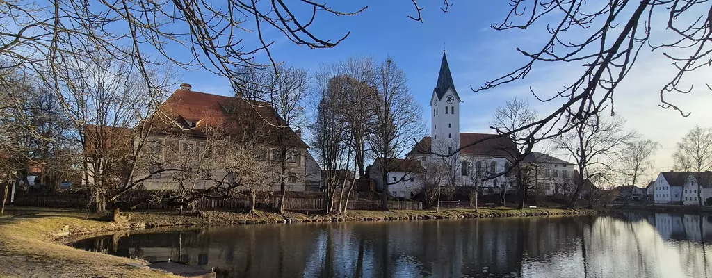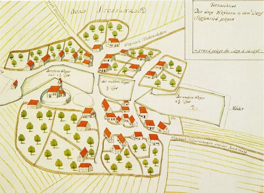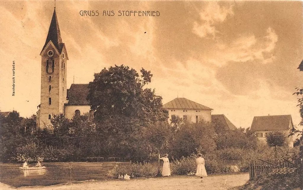 Wer nach einer nicht so spektakulären Anfahrt ganz unvermittelt vor dem großen Dorfweiher steht und auf das gegenüberliegende leicht erhöhte Ufer blickt, das mit drei stattlichen Gebäuden bebaut ist, ist ohne Ausnahme überwältigt von diesem schönen Dorfkern, umso mehr, je klarer sich die Gebäude – das mächtige Elchinger Amtshaus, die Pfarrkirche St. Ägidius, das in stilreinen Formen erbaute Pfarrhaus, die am Nordufer aufgereihten Bauernsölden der Neubesiedelung nach dem Dreißigjährigen Krieg und die hierher geretteten historischen Landwirtschaftsgebäude der Kreisheimatstube im Osten – im großen Weiher spiegeln. So ist es auch nicht verwunderlich, dass 1961, als sich der Landkreis Günzburg erstmals an der Aktion ″Unser Dorf soll schöner werden″ beteiligte, Stoffenried der erste Preisträger im Landkreis wurde.