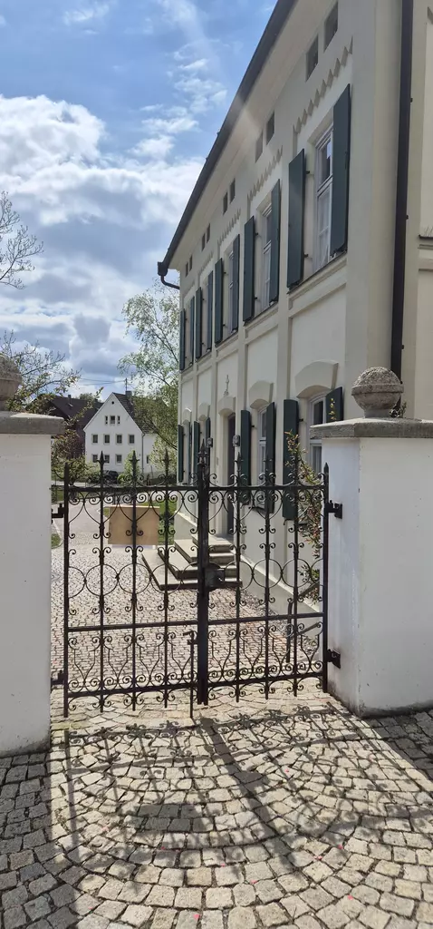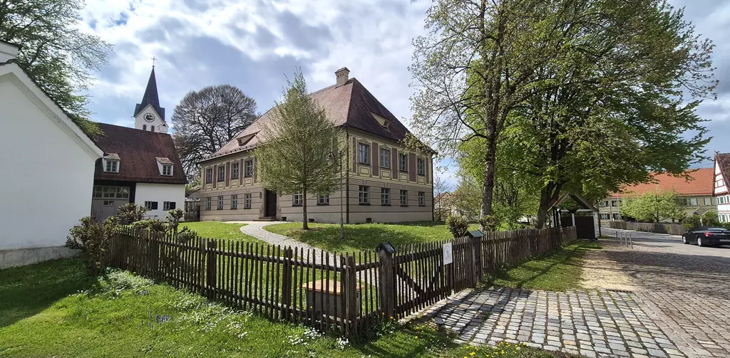 Zwischen Kirche und Kreisheimatstube, direkt an der Dorfstraße und am Weiher erhebt sich ein sehr stattliches Walmdachhaus, das sogenannte Amtshaus des Klosters Elchingen. Es imponiert nicht nur durch seine Größe, sondern fällt jedermann sofort auf durch seine vornehme Fassadenbemalung in allerdings manch düsteren Grundfarben.Graugrün, erdig das Erdgeschoss und die Fensterumrandungen, mit dunkel-braunvioletten Quaderfugen und Pilasteranmutungen im Obergeschoss. Nachdem das Kloster 1673 den Markt Waldstetten verkauft und der Sitz des Pflegers nach Stoffenried verlegt wurde, fehlte mehrere Jahrzehnte ein geeignetes Verwaltungsgebäude, dass sogar die Huldigungen der Untertanen im Freien stattfinden mussten. 1709 ließ Abt Anselm Bauer deshalb ein neues Amtsgebäude aufrichten, das 1771 grundlegend saniert und weitgehend neu aufgebaut wurde. Mit seinem stattlichen, querstehenden Stall- und Wirtschaftsgebäude und weiteren kleineren Nebengebäude ergab sich mehr das Bild einer vornehmen ländlichen Gutsanlage, denn eines reinen Verwaltungsgebäudes. Leider konnten die Elchinger Pfleger sich dieses schönen Amtssitzes nur wenige Jahrzehnte erfreuen, denn nach dem Übergang an Bayern wurde er der Forstverwaltung zugeteilt und Sitz einer der neu geschaffenen bayerischen Oberförstereien. Im Dezember 1804 bezog der aus der Schweiz stammende Gottlieb von Greyerz als erster Stoffenrieder Oberförster den behäbigen Amtssitz mit seinen 12 heizbaren Zimmern und einer modernen Küche, in der beständig fließendes Brunnenwasser zur Verfügung stand. Am 12. Mai 1805 folgten ihm seine Frau, deren Geschwister und ihre Mutter, damals eine der bekanntesten Literatinnen Deutschlands. Ihre Geschichte erzählt eine andere meiner Seiten.