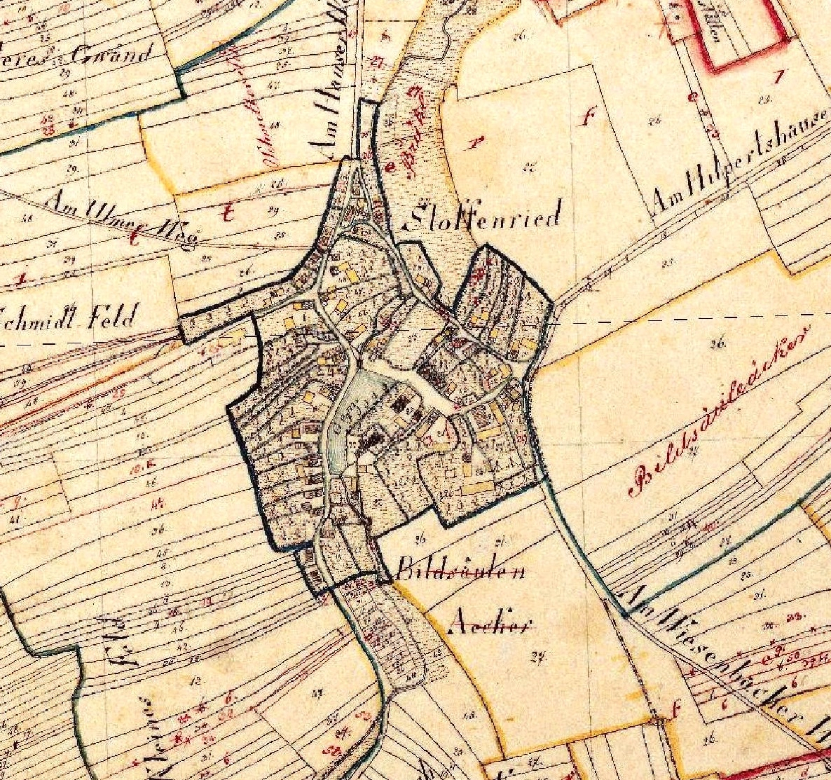 Der Wald wächst auf schweren, lehmigen Böden, die das Wasser reichlicher Niederschläge festhalten und in die Umgebung ableiten. Einer der ableitenden Bäche, der Hausener Bach, fließt mitten durch das Dorf, das wohl bewusst genau hier angelegt wurde. Man darf vermuten, dass der Bach schon bei der ersten Besiedlung in einer Kette von Weihern gestaut wurde. Heute ist aber nur noch der etwa 1 ha große, in der Mitte des Dorfes gelegene Weiher erhalten. Alte Flurpläne aus dem 17. und 18. Jahrhundert zeigen die Weiheranlage noch in ihrem damaligen Zustand. Abt Meinrad Hummel, als Abt des Klosters Elchingen Ortsherr Stoffenrieds, fand Gefallen an den Entwicklungen der mathematischen Wissenschaften und der daraus verbesserten Möglichkeiten der Landvermessung und ließ in der zweiten Hälfte des 17. Jahrhunderts das gesamte Klosterterritorium vermessen und in einem ″Ichnographia″ genannten Atlas aufzeichnen. Da Elchingen Besitzungen in Württemberg und Bayern besaß, wurde der Atlas nach der Säkularisation aufgeteilt. Der unter den Plänen des im Staatsarchiv Augsburg aufbewahrten bayerischen Kartenteils befindliche Plan Stoffenrieds von 1679 zeigt eine Kette von drei Weihern, von denen nur der erste und größte noch existiert. Der zweite, kleinste, nahm den Grund auf dem heute das Gelände der Kreisheimatstube steht ein. Nach einer deutlichen Geländestufe folgte ein dritter, sich mehr in nördlicher Richtung erstreckender Weiher. Seinen stauenden Wall kann man bis heute am nördlichen Ortsrand sehen, er bildet jetzt die Begrenzung einer im Rahmen der Dorferneuerung angelegten Sportgeländes.